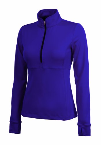 92% polyester/8% spandex jersey knit made with TopShield moisture management treatment. Quarter zip design with black zipper, self fabric stand-up collar and princess seams. Extra-long sleeves include thumbholes for style and to keep sleeves in place. Slight dropped tail hem for extra coverage.