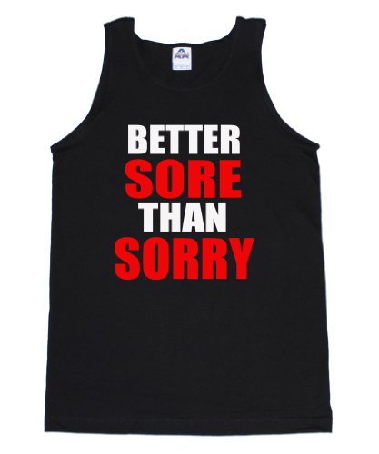Tank Top. 100% Cotton. Pre-shrunk by Manufacturer (but will still shrink slightly after the first wash). Standard Adult Sizing (normal fit): SIze Small to XL available (XXL available, but at an additional cost +$2).FTD Apparel Men's Better Sore than Sorry Workout Tank Top-Large Black